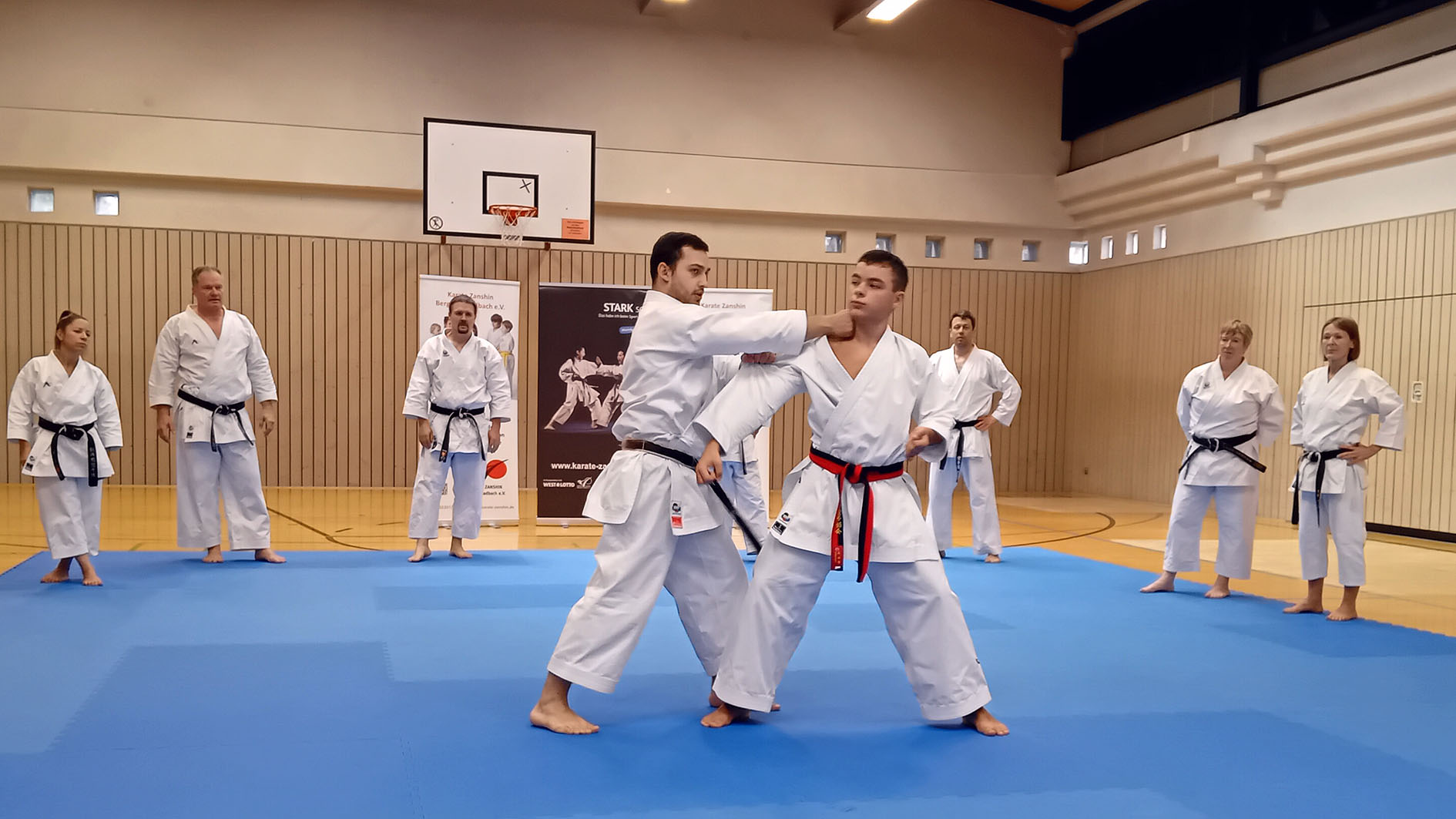 Sichtlich stolz und voller Energie präsentierte sich der erfolgreiche Bundeskaderathlet Yannick Drescher (25j., 3. Dan, B-Trainer Leistungssport) von Karate-Zanshin Bergisch Gladbach e.V. am Sonntag, den 14. September 2025 den Teilnehmenden seines Lehrgangs aus der renommierten Shotokan-Reihe des KDNW im heimischen Dojo der Friedrich-Fröbel-Schule in Moitzfeld.