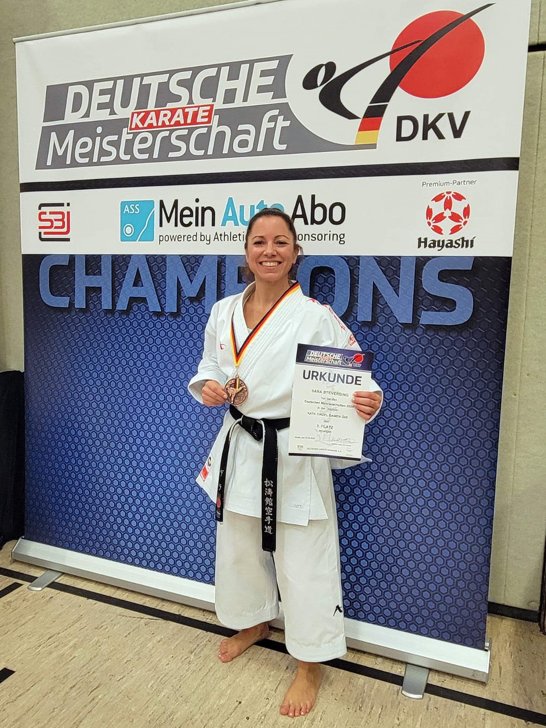 Bereits in der ersten Runde überzeugte Sara mit 20.80 zu 19.10 Punkten für ihre Suparimpei gegen Oxana Traiber vom Dhammika Karate Amorbach. Besonders beeindruckend danach ihr Sieg über die bis dato amtierende Deutsche Meisterin der Masterclass, Manuela Klaas vom Karate Dojo Mayen-Mendig, die sie mit ihrer Gojushiho Sho und 21.80 zu 21.00 Punkten hinter sich lies. Im Poolfinale aber unterlag sie trotz lupenreiner Gojushiho Dai mit nur einem Zehntel Rückstand auf ihre Rivalin Michèle Kabisch vom SV Unsu Karate Mömlingen, die clever taktierte und für ihre Kata Sochin 22.50 Punkte erhielt. Definitiv ein Duell auf Augenhöhe. Im „Kleinen Finale“ besiegte Sara mit ihrer Kanku Sho und 37.20 zu 35.20 Punkten sehr deutlich ihre Gegnerin Inga Conrad vom Seishinkai Zentraldojo Jena und holte hier mit der Bronzemedaille für den 3. Platz ihre erste Platzierung auf einem DM-Treppchen.