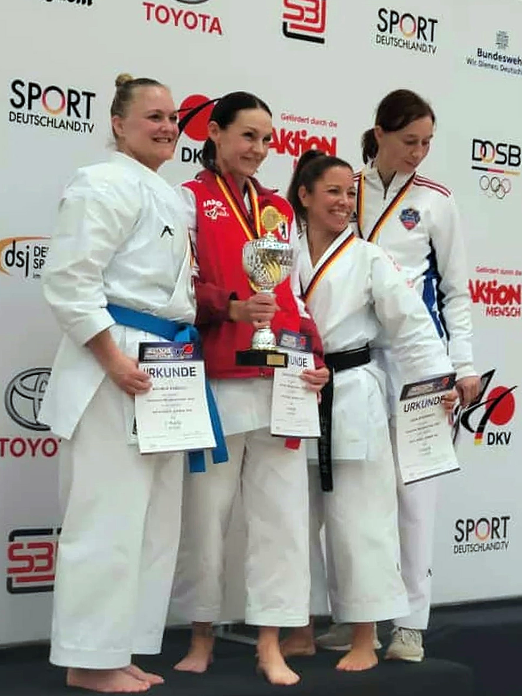 Auch Sara Steverding (2. Dan) vom Karate-Zanshin Bergisch Gladbach e.V. ging hier in der Kategorie Damen Kata Einzel Ü45 auf Titeljagd und griff nach den begehrten Edelmetallen. Obwohl eine schwere Erkältung ihre Vorbereitungen für die Meisterschaft stark einschränkte, konnte Zanshin-Cheftrainer Hardy Berscheid seiner Schülerin alles Notwendige mit auf den Weg geben, um eine wirklich hervorragende Vorstellung in Verden abzuliefern.