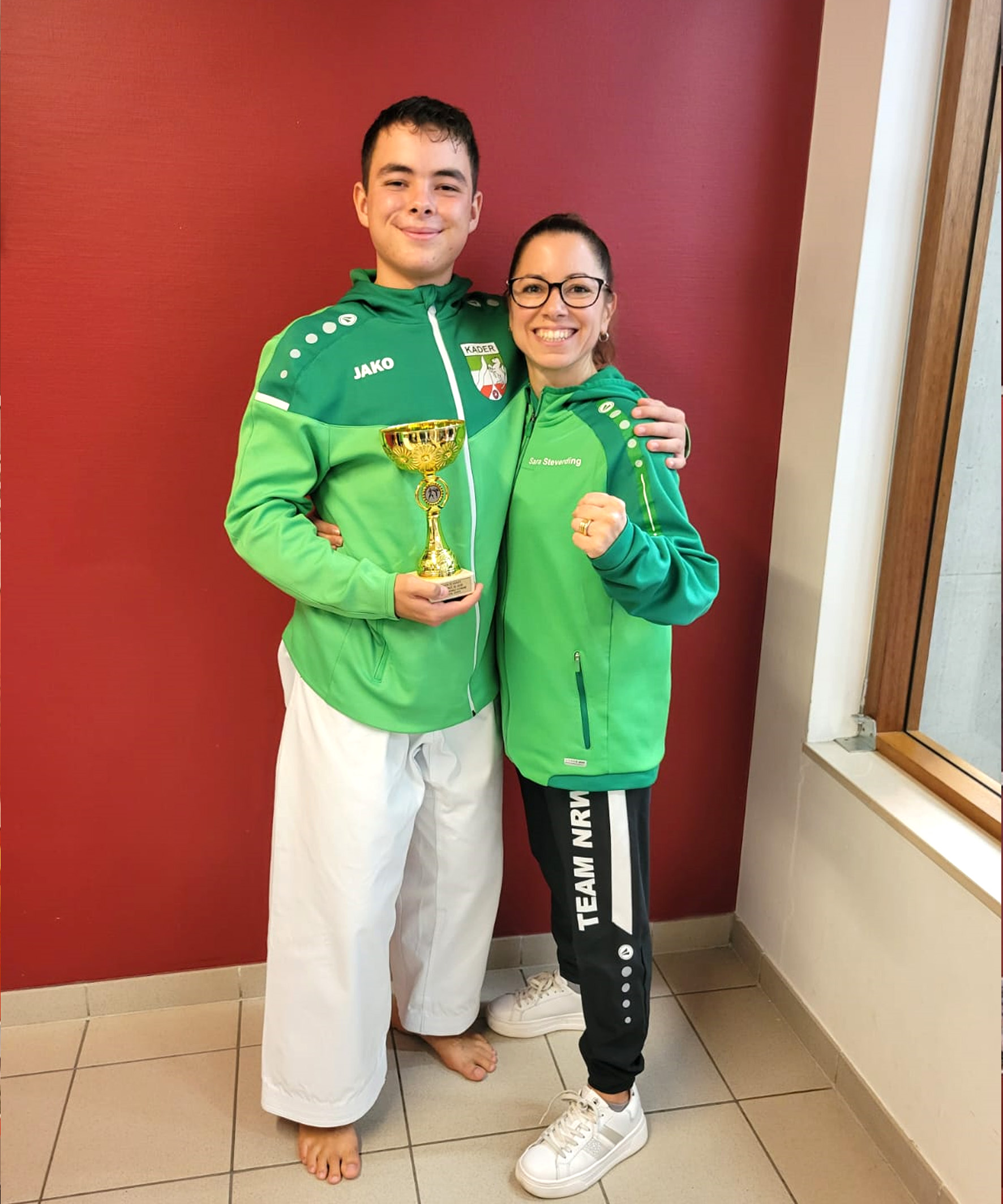 Micheles Mutter Sara Steverding, die vor Kurzem auf der Deutschen Meisterschaft der Masterclass den 3. Platz im Kata Einzel Ü45 erreichte, ist unglaublich stolz auf die Leistung ihres Sohnes (Foto oben). Auch sein Trainer Hardy Berscheid, der seine Karriere von Anfang an begleitet, zeigt sich zufrieden mit der Leistung seines Schützlings.