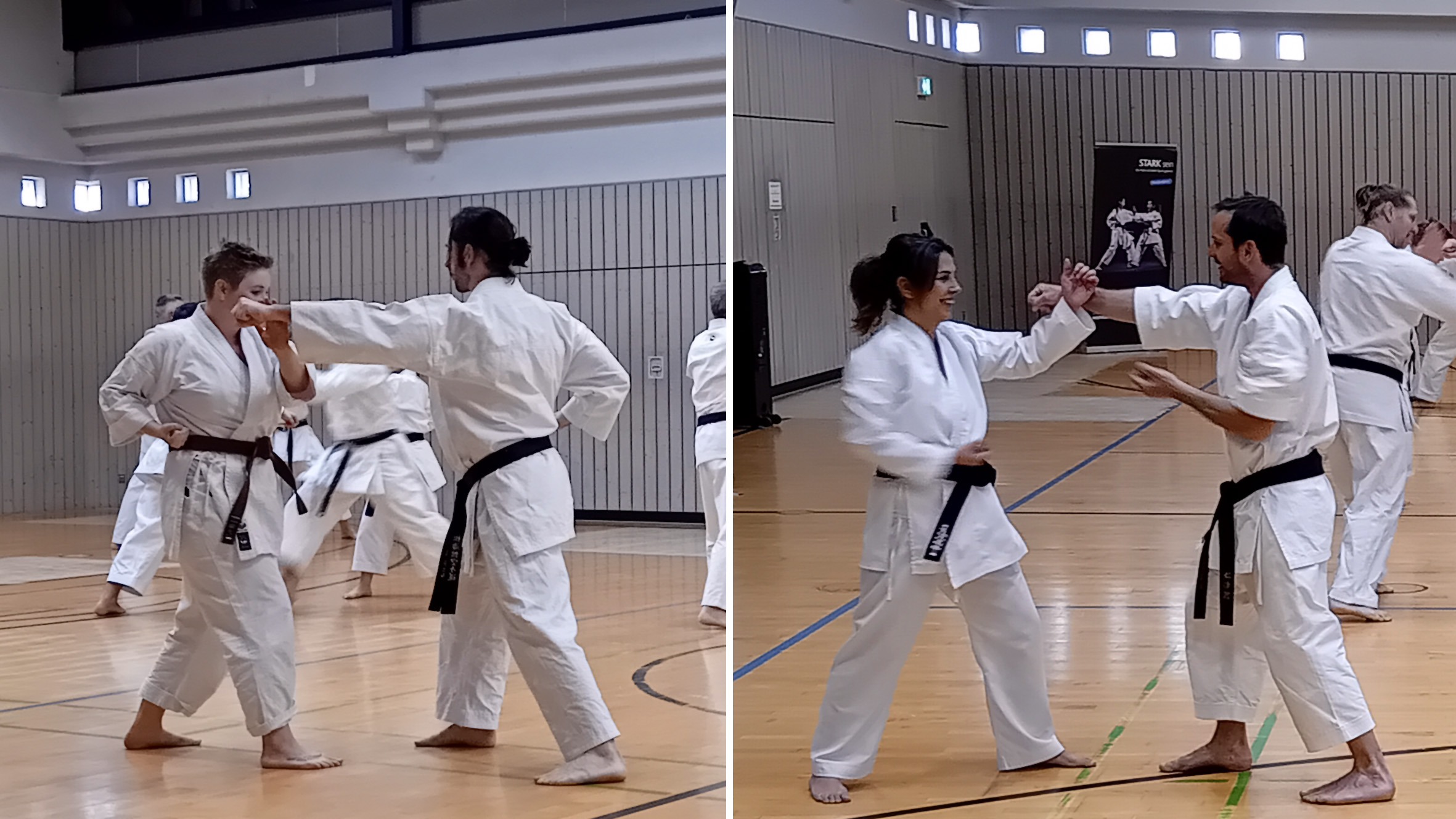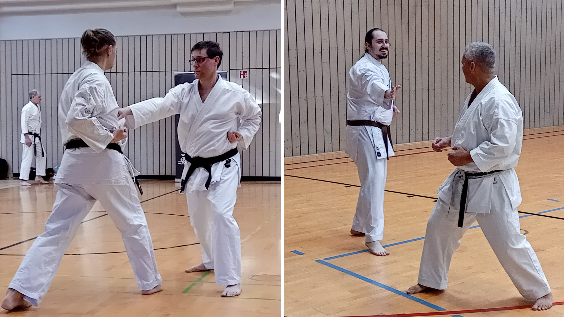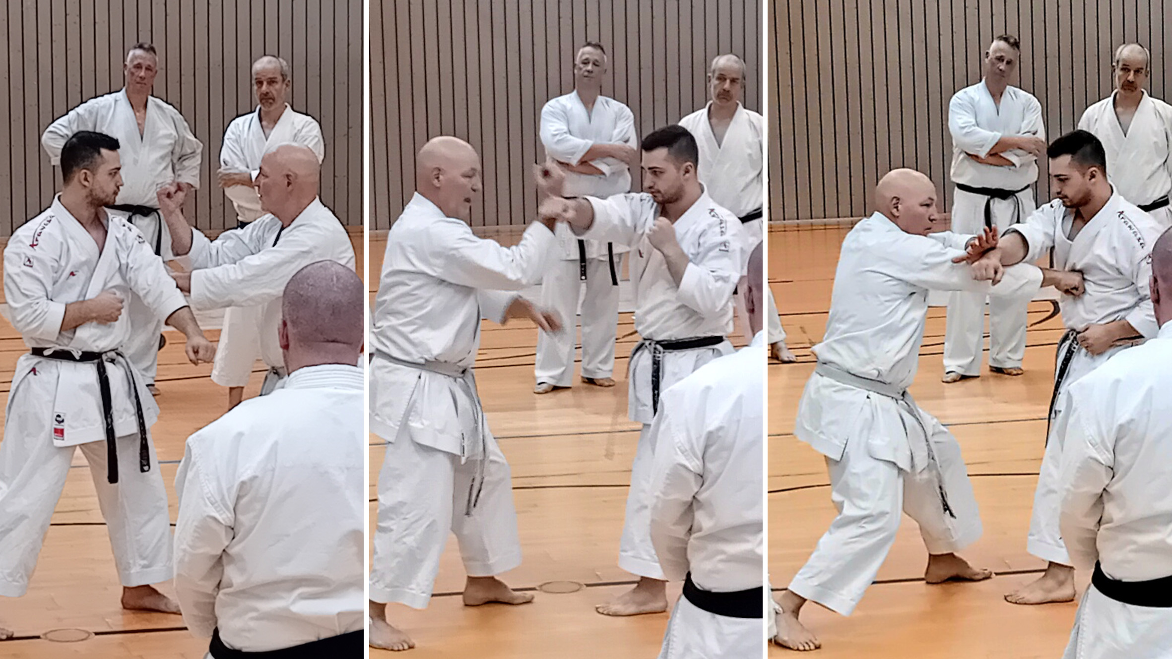 Sensei Berscheid wollte den Teilnehmenden aber nicht nur die Techniken der Kata und deren Rhythmus näherbringen, sondern legte auch diesmal wieder großen Wert auf die richtige Anwendung der Techniken und das Verständnis für die Idee hinter der Kata. „Die Kata gibt die Form vor, aber in der Anwendung müsst ihr das mit Leben füllen!“, erklärt Berscheid, und ergänzt: „Da ist so viel, 1000 Sachen. Wichtig ist, dass du eine Idee hast, was du später vorstellst. Darum geht’s ja bei einer Vorführung, du musst die Kata zum Leben erwecken!“