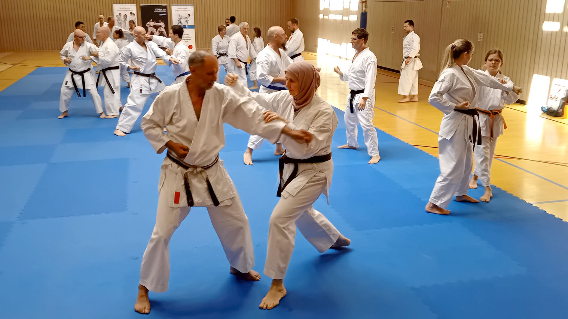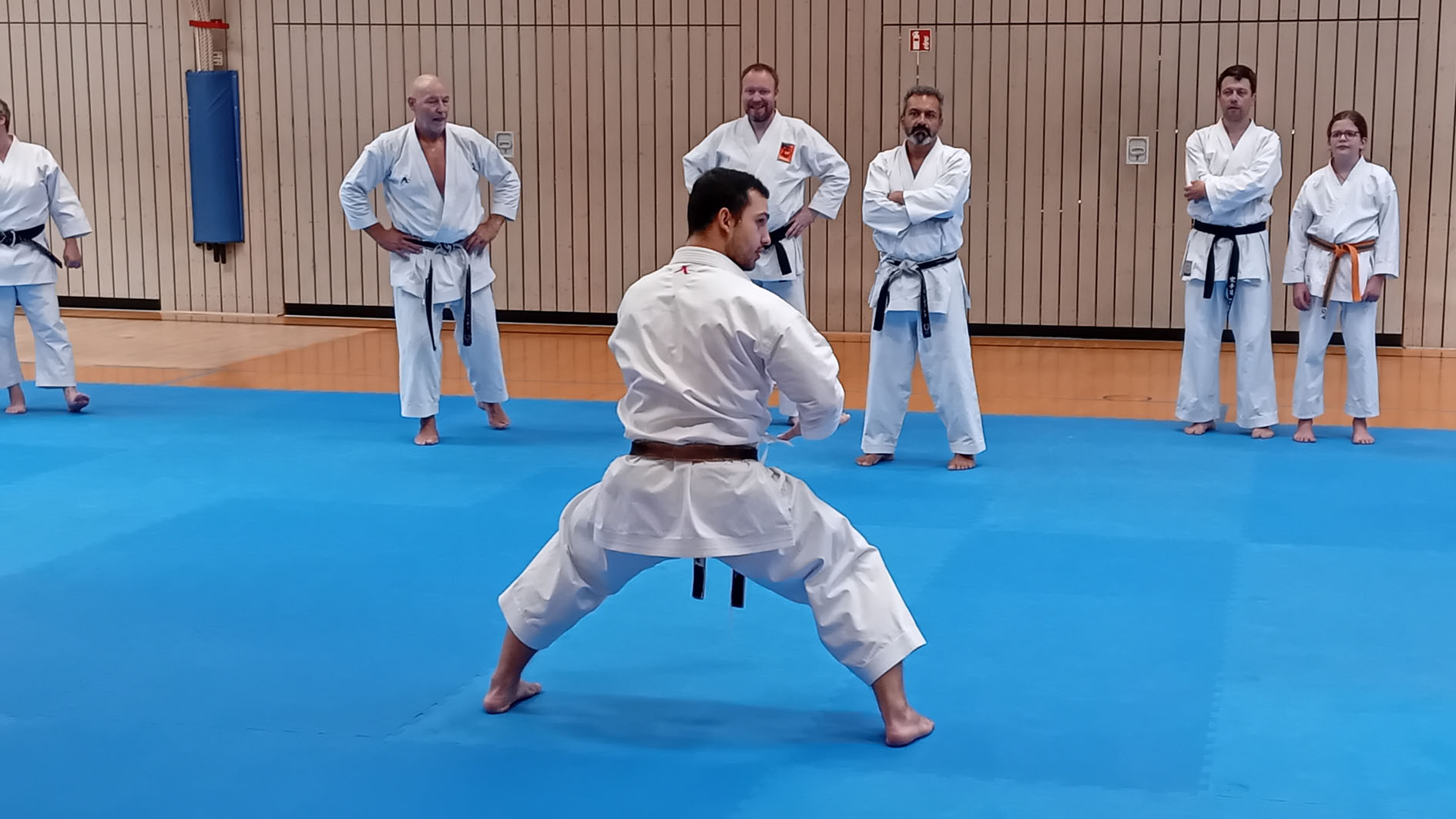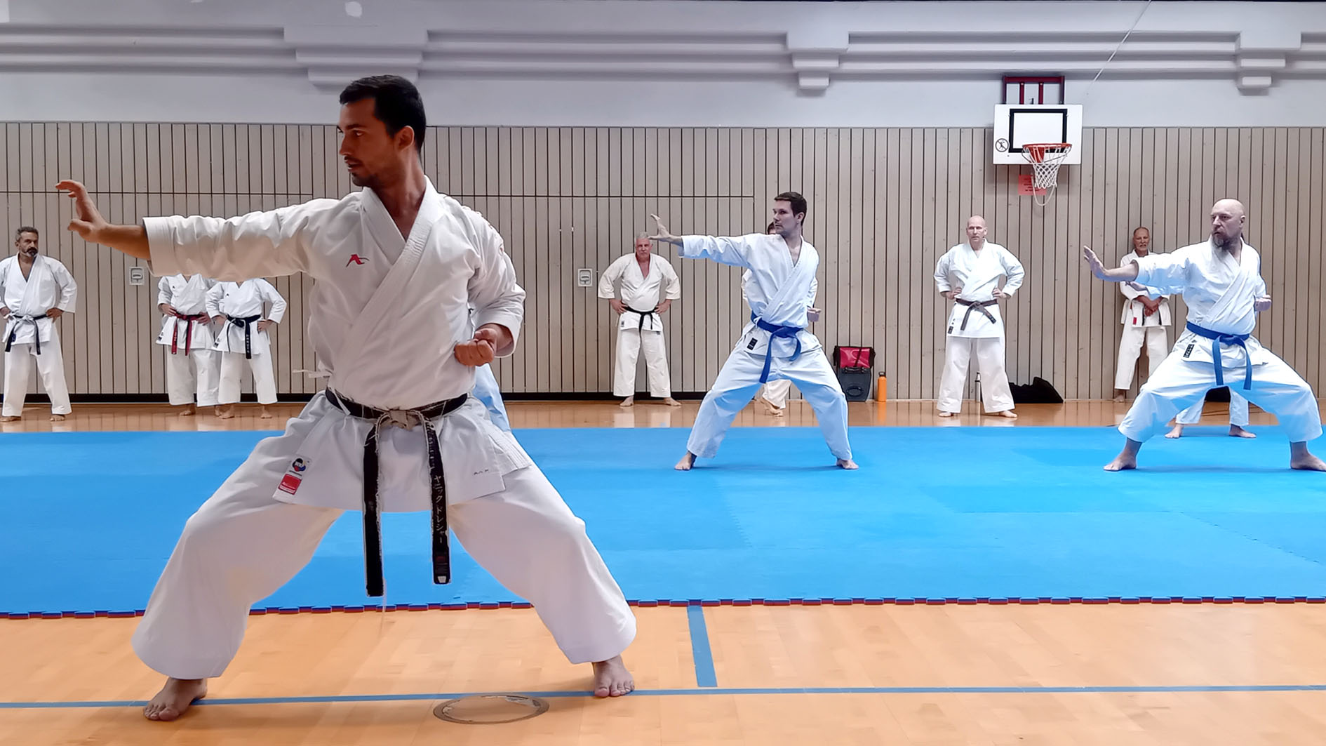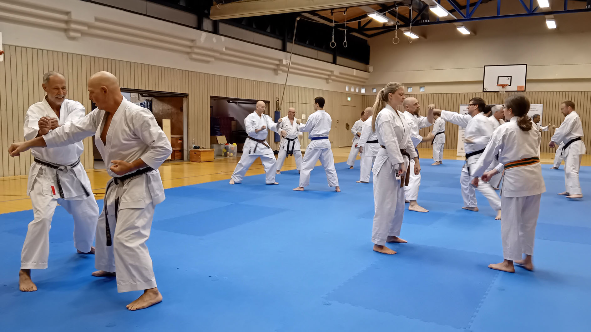 Anschauliche Erklärungen, Vorführungen und interessantes Hintergrundwissen wechselte sich mit gezieltem Techniktraining und anspruchsvollen Partnerübungen ab. Geduldig beantwortete Drescher ausführlich die Zwischenfragen der Teilnehmenden und zeigte schwierige Passagen auch gerne mehrmals. Zum Ende des Lehrgangs fügten sich die erlernten Techniken und Abläufe zur vollständigen Kata Tekki Nidan zusammen.