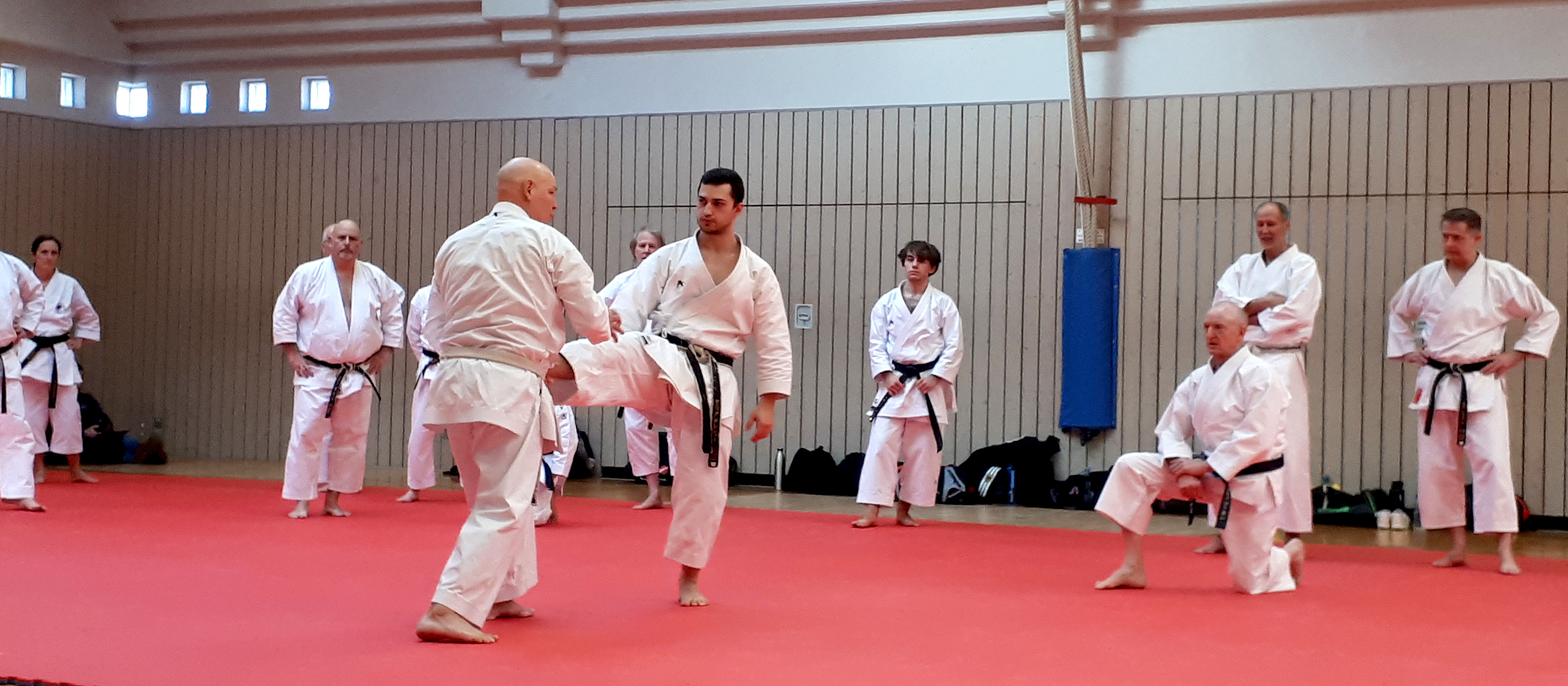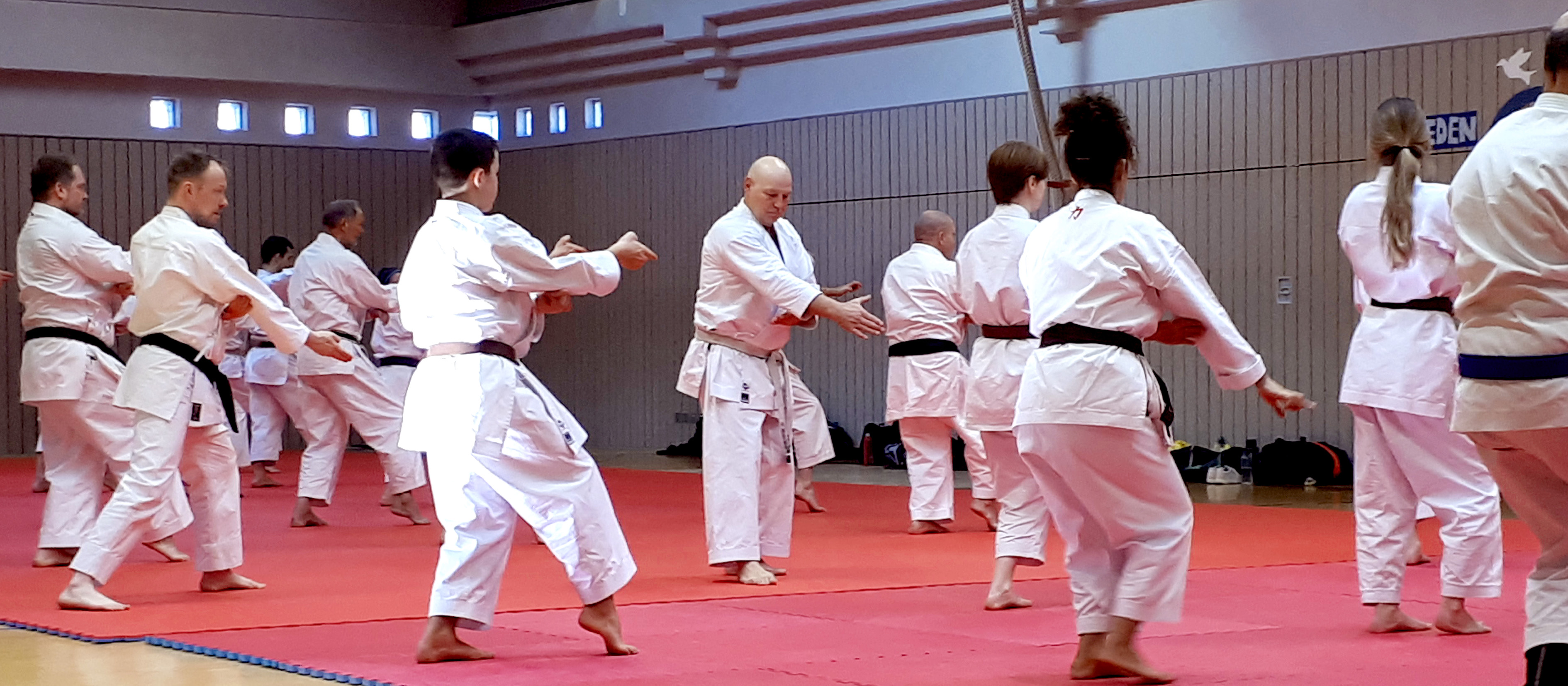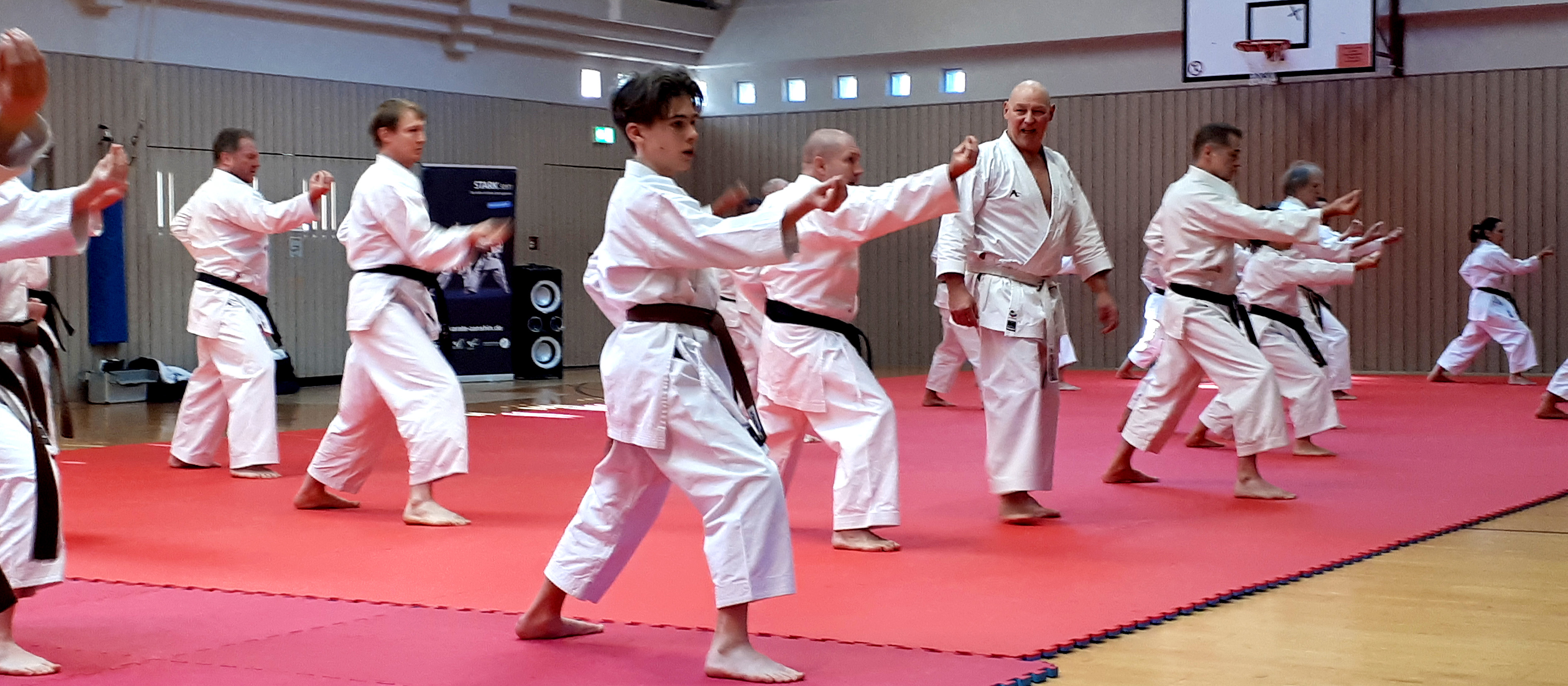 Es gab während des Lehrgangs zahlreiche „Aha!-Momente“. Hardy Berscheid weiß wie kaum ein anderer, seine Schülerinnen und Schüler mit seinen Erklärungen zu fesseln, sie für die Sache zu begeistern und zu hohen Leistungen zu motivieren. Kurze Theorie-Blöcke wurden begleitet von Anschauungsbeispielen, immer gefolgt von dem gemeinsamen Erarbeiten des entsprechenden Kata-Abschnitts mit den Teilnehmenden. Am Ende des Tages fügte sich alles zu einem großen Ganzen zusammen, als alle gemeinsam mit dem neuen Wissen im Hinterkopf die vollständige Kata liefen. Das Ergebnis war beeindruckend.