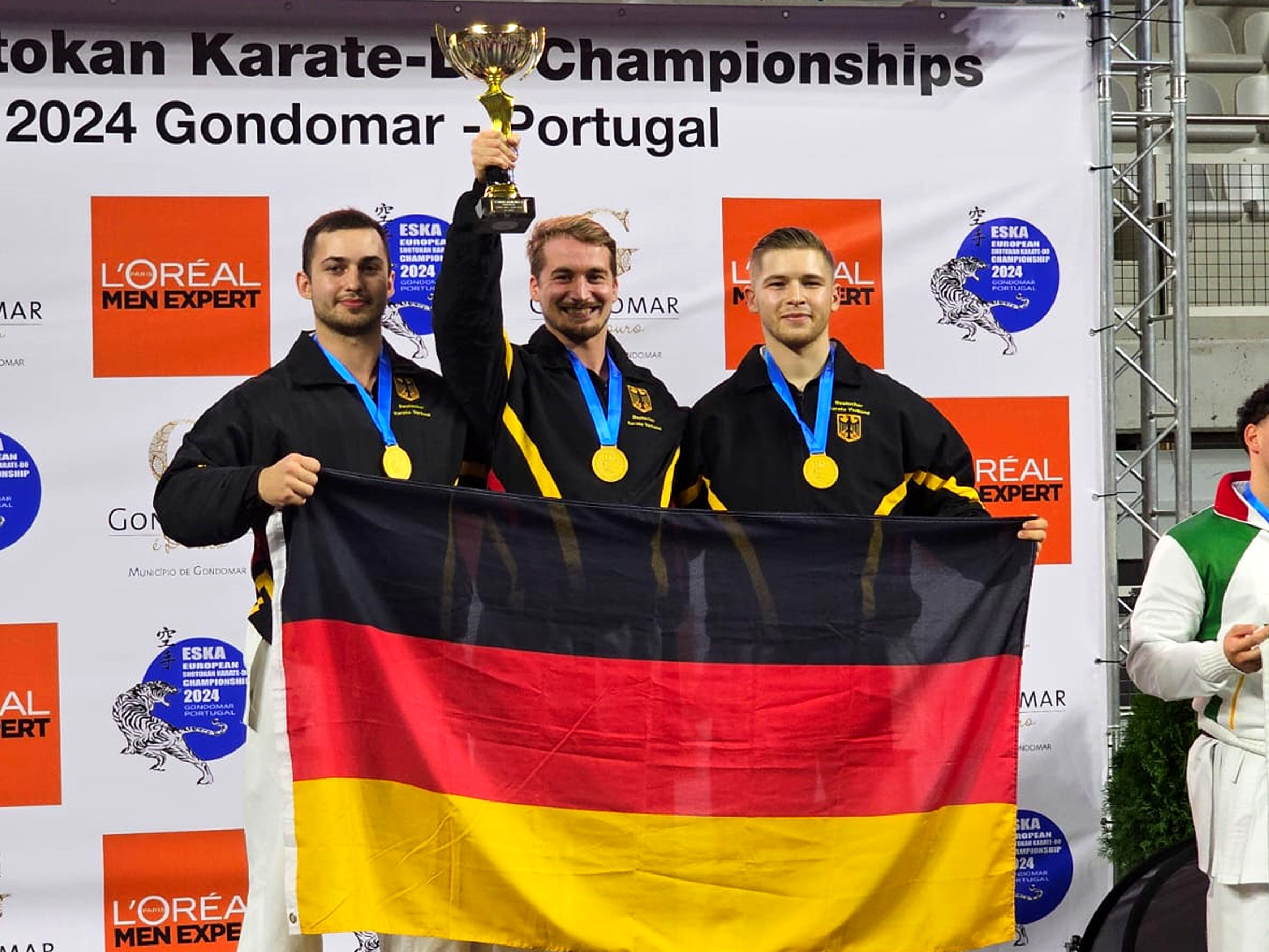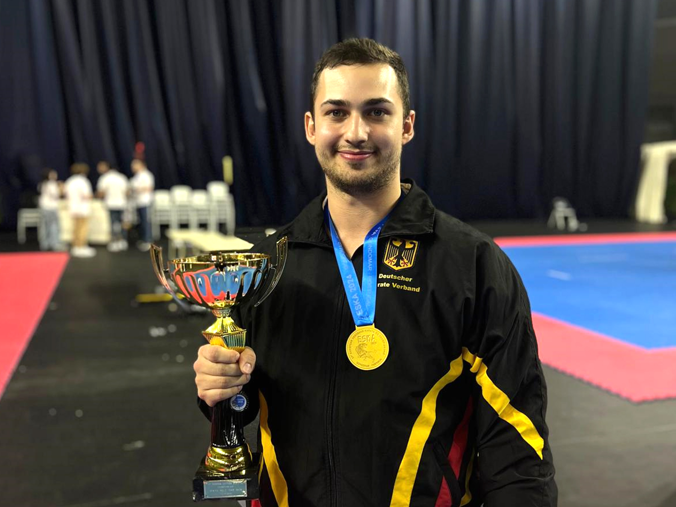 Gemeinsam mit den Teamkollegen Roman Lux und Fabian Straub ging Yannick in der Kategorie Senior Men Kata Team auf Titeljagd. Und die Drei bewiesen, dass sich langes, hartes Training immer auszahlt. Mit perfekt synchron vorgetragenen und enorm energiegeladenen Katas kämpfte sich das deutsche Kata-Team Schritt für Schritt ins Finale vor. Hier besiegten sie im nervenaufreibenden Endkampf das Team aus Italien knapp nach Punkten und holten sich verdient den Titel des Europameisters und den prachtvollen, goldenen Pokal. Dritter wurde das Kata-Team aus Portugal, der 4. Platz ging an Serbien.
