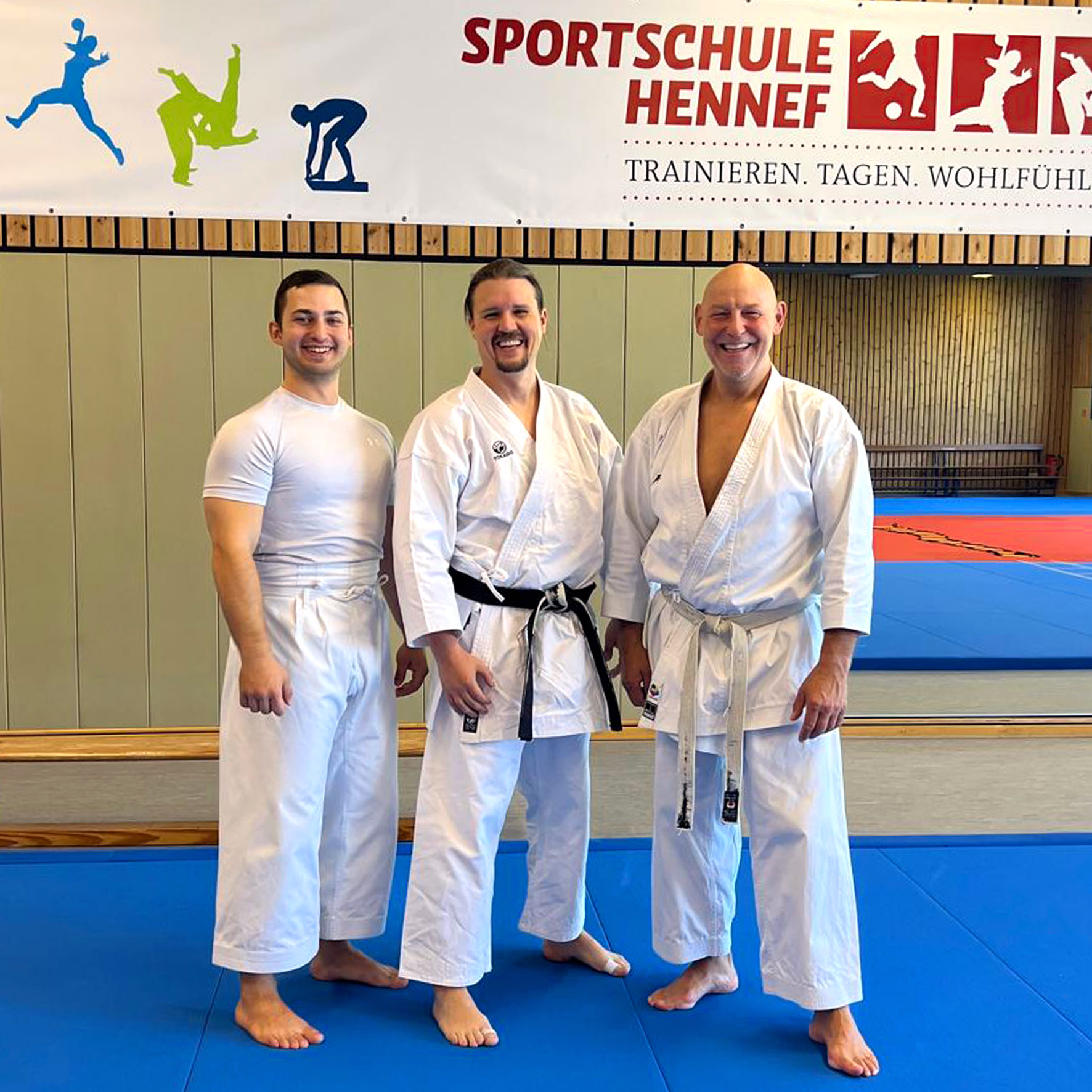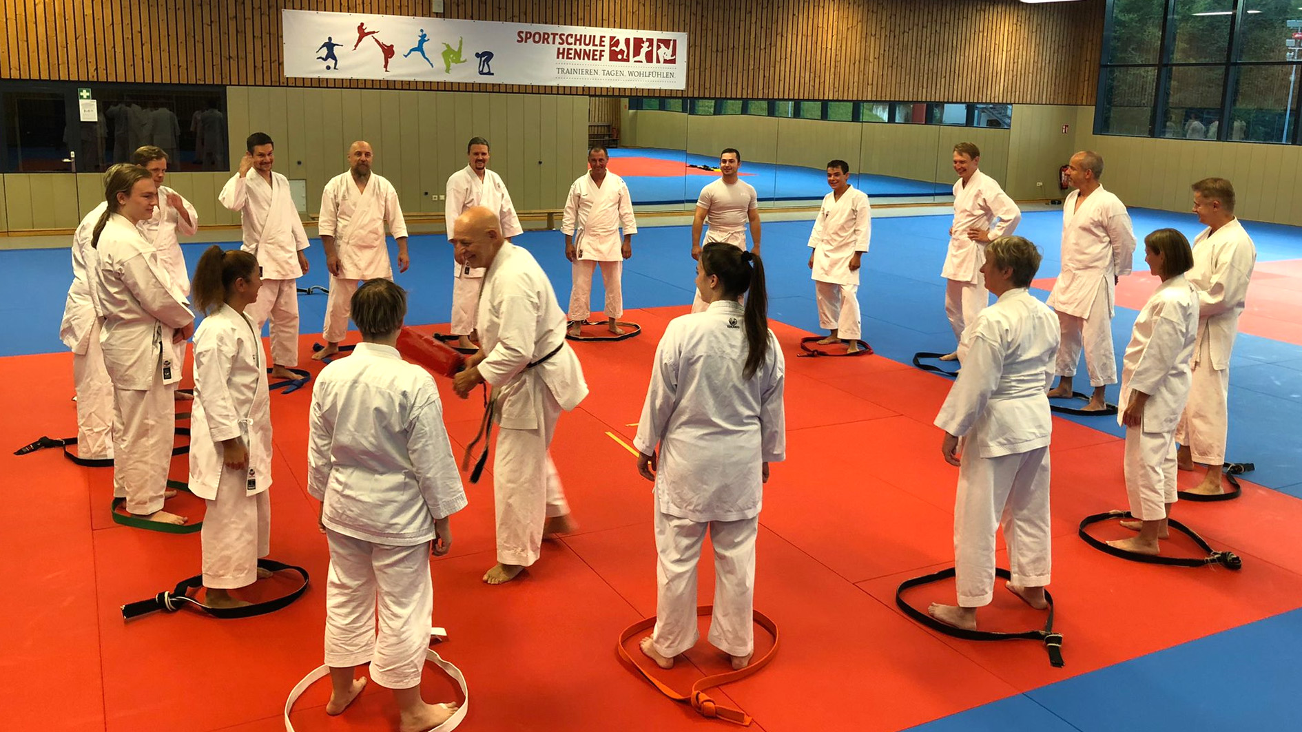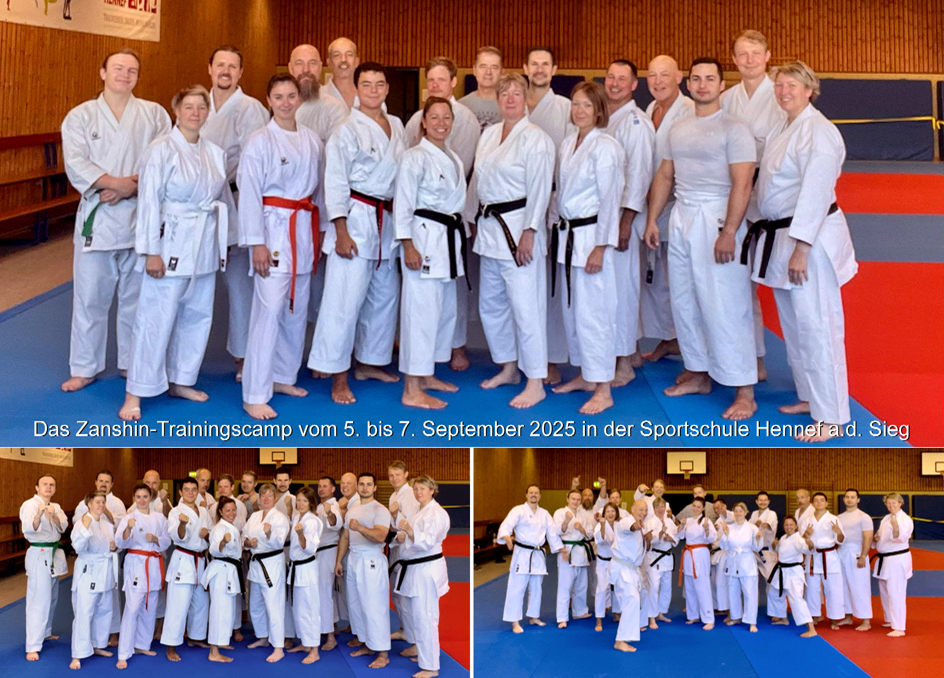 Es war ein großartiges Wochenende, als Karate-Zanshin Bergisch Gladbach e.V. vom 5. bis 7. September 2025 sein großes Zanshin-Trainingscamp 2025 in der Sportschule Hennef a.d. Sieg veranstaltete. Gut 20 erwachsene Mitglieder, allen voran Zanshin-Cheftrainer Hardy Berscheid (6. Dan, KDNW-Leistungssportreferent), Michael Laudenberg (4. Dan, C-Trainer Leistungssport) und Yannick Drescher (3. Dan, B-Trainer Leistungssport), hatten sich für den lange erwarteten, mehrtägigen Lehrgang angemeldet. Berscheid, Laudenberg und Drescher übernahmen die Leitung der breit gefächerten Kurse und Lehrgänge rund um das Shotokan-Karate. Aber auch Freizeit- und Team-Building-Events standen auf dem gut gefüllten Stundenplan, sowie gemeinsame Mahlzeiten im bestens ausgestatteten Speisesaal der Sportschule und gesellige Abende im Bistro der Anlage. Die Nächte verbrachten man sehr komfortabel im Sporthotel auf dem Gelände.