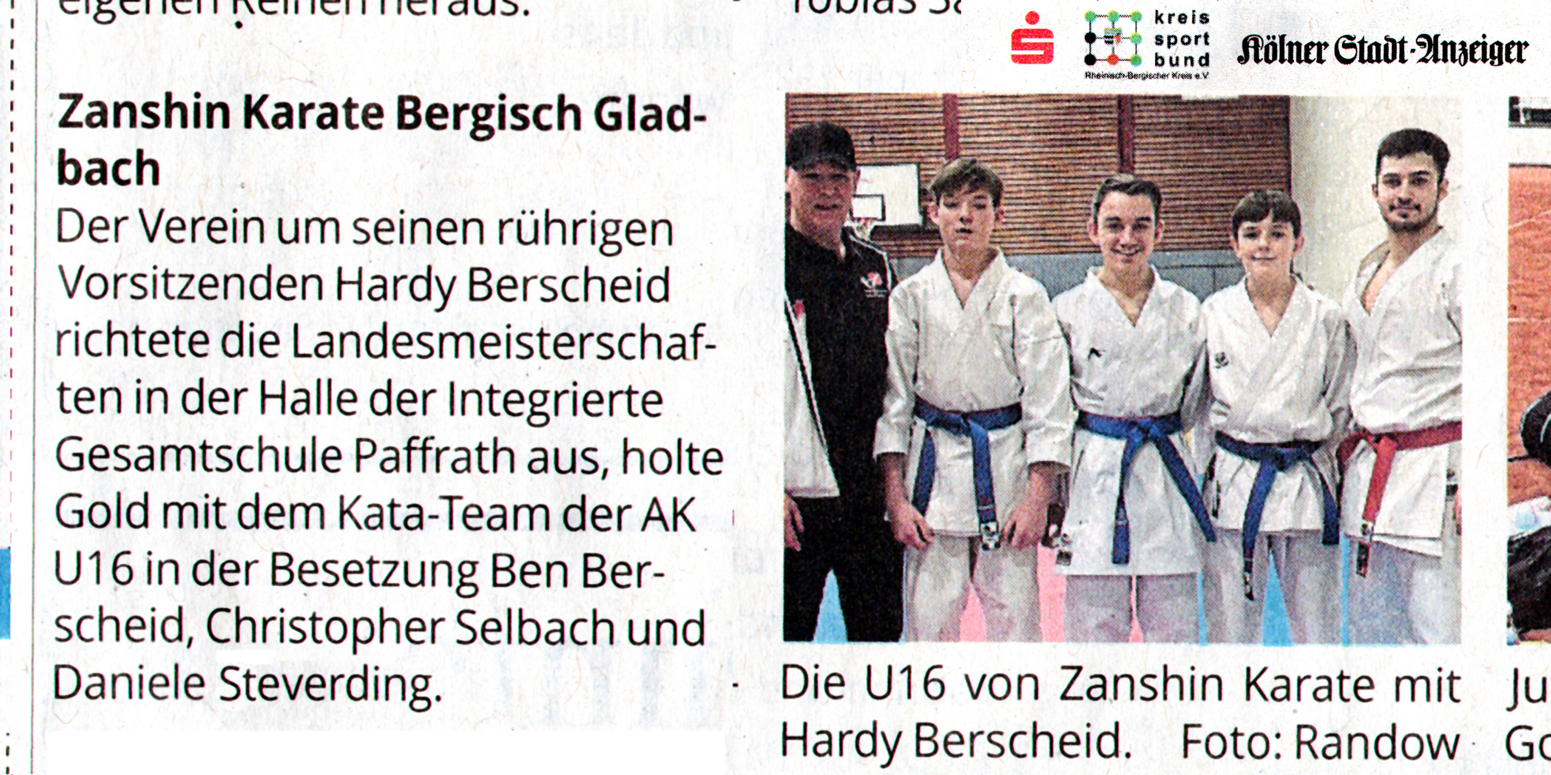 Nachdem vor zwei Wochen der Kölner StadtAnzeiger in einem sportlichen Jahresrückblick bereits die Erfolge und Leistungen von Karate-Zanshin Bergisch Gladbach e.V. und seinem Vorsitzenden Hardy Berscheid nochmal würdigte, folgte nun in der Ausgabe vom 16./17. Januar 2021 eine Anerkennung der besonderen Art. Das U16 Kata-Team von Karate-Zanshin ist eine von zehn nominierten Mannschaften für die Wahl zum Sportler des Jahres 2020. Das von Hardy Berscheid und Yannick Drescher trainierte Team mit Ben Berscheid, Christopher Selbach und Daniele Steverding holt zuletzt auf der NRW Landesmeisterschaft Gold in der U16.